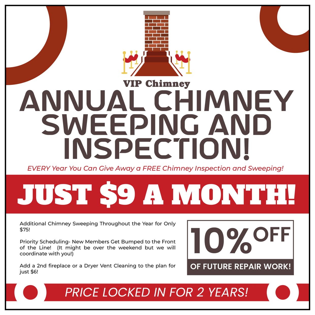 We love it when our customers return every year for a sweeping and inspection. So to reward them and to encourage others to have their chimneys checked out yearly instead of every few years, we created VIP Chimney! At just $9 a month, it's more than a 64% discount. Lots of perks included too, keep reading to find out!